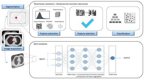 The following two methods can be used to perform a radiomic analysis: hand-crafted feature processing, or deep learning (DL). Hand-crafted feature (e.g., texture, shape, intensity, wavelet) processing will afford information on a specific targeted area of the imaging modality, distinctively from other related data (e.g., clinical, biological, genomic, histological, or treatment-related data). Contrastingly, deep learning methods will proceed to an extensive data-driven approach, processing a huge amount of information on the model of a simplified neural brain network, and without needing prior image segmentation (Figure 1).
