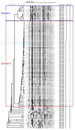 Among the 89 CRKP strains, 58 (65.2%) isolates carried KPC genes, and all were blaKPC-2 genes. According to the results of PFGE, two distinct clusters could be identified from the CRKP strains (Figure 1): 11 (12.4%) strains in the cluster I, 62 (69.7%) in cluster II, and others (18.0%). All the strains carrying KPC genes were in cluster II. None of the cluster I and II strains had blaOXA-48 genes. Notably, we noted that the survival group had a reduced proportion of KPC genes (51.2% vs. 78.3%, p = 0.008) and the cluster II strains (53.5% vs. 84.8%, p = 0.006) as compared to the mortality group (Table 1).