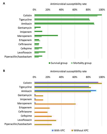 Antimicrobial susceptibility of carbapenemase-producing Klebsiella pneumonia isolates according to 30-day mortality (A) and the presence of Klebsiella pneumonia carbapenemase (KPC) genes (B). KPC, Klebsiella pneumoniae carbapenemase.