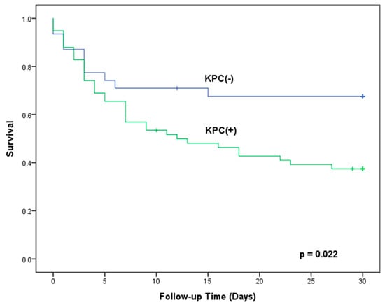 For patients with CRKP BSI, multivariate analysis revealed that microbiologic eradication within 7 days (adjusted HR = 0.09, p < 0.001), platelet count (per 1 × 104/mm3, adjusted HR = 0.95, p = 0.002), and Pitt bacteremia score (adjusted HR = 1.40, p < 0.001) were independently associated with 30-day all-cause mortality. The univariate Kaplan-Meier method revealed that CRKP patients with KPC genes had significantly higher 30-day mortality than those without KPC genes (62.6% vs. 32.4%, p = 0.022) (Figure 3). However, the predictive role of the presence of KPC genes was not confirmed by the multivariate model. None of the antimicrobial regimens was significantly associated with 30-day mortality (Table 3).