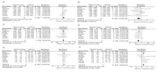 For Cmax of losartan, there was no significant difference between subjects with CYP2C9*2 or *3 alleles and those with CYP2C9*1/*1 (MD 0.01 ; 95% CI: −0.02, 0.03) (Figure 2c). Heterogeneity was not detected among the studies ( = 0%). However, subjects with CYP2C9*2 or *3 variants showed lower Cmax of E-3174 than those with CYP2C9*1/*1 (MD −0.13 ; 95% CI: −0.17, −0.09) (Figure 2d), with no heterogeneity (= 0%). Subjects with the CYP2C9*2 or *3 carriers showed significantly longer half-lives of losartan and E-3174 than those with the CYP2C9*1 carrier (MD 0.47 h; 95% CI: 0.32, 0.61 and MD 0.68 h; 95% CI: 0.44, 0.92, respectively) (Figure 2e,f). Neither Begg’s test nor Egger’s test showed significant publication bias for all analyses.