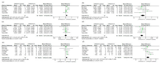Forest plot comparing the mean difference between CYP2C9*2 or *3 carriers and CYP2C9*1/*1. (a) AUC0-∞ of losartan (), (b) AUC0-∞ of E-3174 (), (c) Cmax of losartan (), (d) Cmax of E-3174 (), (e) half-life of losartan (h), (f) half-life of E-3174 (h).
