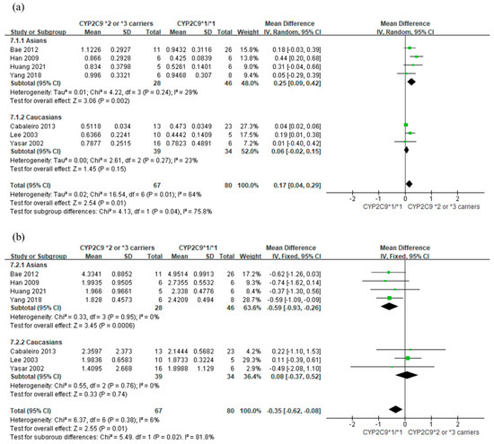 Based on the seven studies in Figure 2, subjects with CYP2C9*2 or *3 carriers showed higher AUC0-∞ of losartan than those with CYP2C9*1/*1 (MD 0.17 ; 95% CI: 0.04, 0.29) (Figure 2a). Heterogeneity was detected among the studies ( = 64%; p = 0.01). In contrast, subjects with CYP2C9*2 or *3 carriers showed significantly lower AUC0-∞ of E-3174 compared to those with CYP2C9*1/*1 (MD −0.35 ; 95% CI: −0.62, −0.08), with low heterogeneity ( = 6%) (Figure 2b).