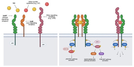 - Murakami, M.; Kamimura, D.; Hirano, T. Pleiotropy and Specificity: Insights from the Interleukin 6 Family of Cytokines. Immunity 2019, 50, 812–831. [Google Scholar] [CrossRef]