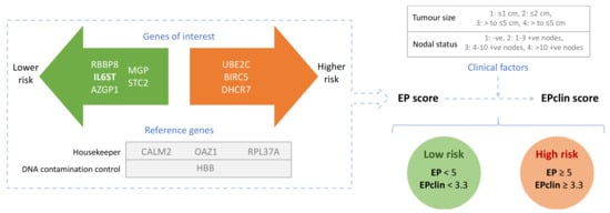 | Filipits et al. (2011) [44] | EndoPredict | Low risk-associated (surrogates for ER signalling/cell differentiation): RBBP8, IL6ST, AZGP1, MGP, STC2 |