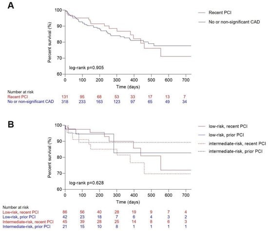 Median follow up was 218 [IQR 84–422] days, with a median survival after TAVR of 613 [IQR 587–639] days. Overall, 63 (14%) patients died in the observational period. Death occurred in 18 (14%) patients with recent revascularization and 45 (14%) patients with no or non-significant CAD. Between these two groups, Kaplan–Meier analysis illustrated no difference (Figure 1A, log-rank p = 0.905). Further stratifying both groups into either low or intermediate risk also did not reveal differences in survival (Figure 1B, log-rank p = 0.628).