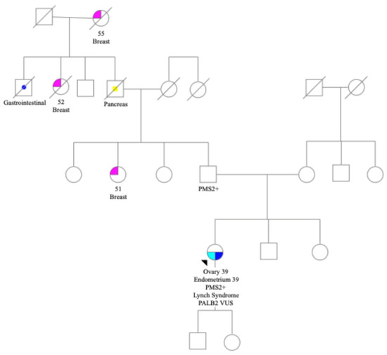 This patient had a personal and family history of cancer that was not consistent with the moderate-risk PMS2 Lynch syndrome risk profile in NCCN [3]. The Prospective Lynch Syndrome Database has reported primarily colorectal and endometrial cancer risk to be associated with PMS2 [23]. This patient’s personal and family history included ovarian cancer, three cases of breast cancer, and pancreatic cancer. These are all at lower risk in PMS2 germline carriers, but breast cancers have been reported in some PMS2 Lynch patients [24]. Although PMS2 mutation carriers do have lower overall cancer risk compared to other Lynch mutations carriers, a smaller study of PMS2 LS patients showed that 60% of patients with MMR-deficient/MSI tumors presented with extracolonic cancers [25]. The NCCN guidelines primarily address surveillance and prevention strategies for colon and gynecological cancers with PMS2 germline mutation. Clinicians may consider family history to determine any indication for screening other cancers.