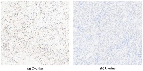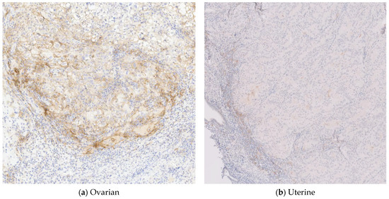 PD-L1 (22C3) expression of the (a) ovarian tumor showed 10% tumor cell positivity, while the (b) uterine tumor was negative.