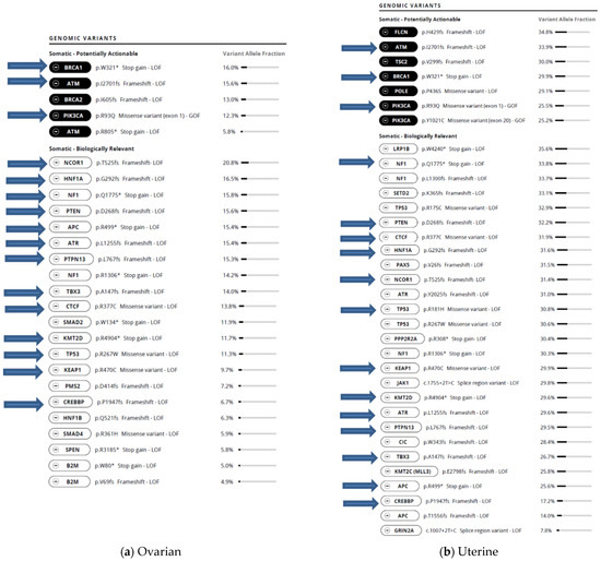 Somatic potentially actionable variants and biologically relevant variants (common variants shown with blue arrows) with variant allele fractions in (a) ovarian and (b) uterine tumors. A nonsense variant that removes the entire C-terminal part of the protein at the site of the variant is denoted with a * after the relevant amino acid.