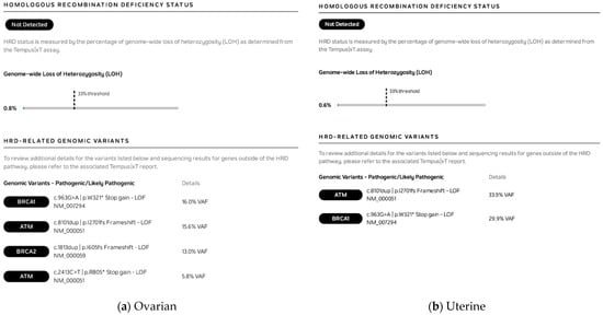 Homologous recombination deficiency (HRD) was also evaluated via genome-wide loss of heterozygosity (LOH) in each tumor (Figure 5). While both tumors demonstrated pathogenic/likely pathogenic genomic variants in the HRD pathway (BRCA1/2 and ATM), the genome-wide loss of heterozygosity (LOH) was well below the threshold of 33% and was deemed “not detected”.