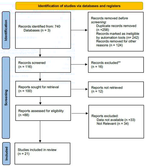 - Page, M.J.; McKenzie, J.E.; Bossuyt, P.M.; Boutron, I.; Hoffmann, T.C.; Mulrow, C.D.; Shamseer, L.; Tetzlaff, J.M.; Akl, E.A.; Brennan, S.E.; et al. The PRISMA 2020 statement: An updated guideline for reporting systematic reviews. BMJ 2021, 372, n71. [Google Scholar] [CrossRef]