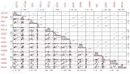 Several sICs showed a significant correlation at baseline. A Pearson’s correlation > 0.8 indicates a strong correlation between variables (e.g., sLAG3 values are statistically significantly associated and directly correlated with CTLA4, PD-L1, GITR, CD80, and IDO values with a correlation value of 0.9, 0.85, 0.87, 0.78, and 0.77, respectively; p < 0.001; Figure 1).