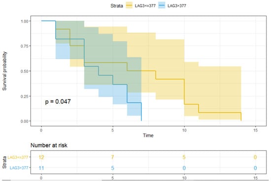 The PFS over time according to sLAG3 value. Figure 2 shows the PFS over time (expressed in months after the start of treatment) in patients with/without an LAG3 value higher than the median. The number of patients at risk is also indicated. PFS refers to progression-free survival; 377 is the median value of LAG3, expressed in pg/mL; the blue line represents OS in patients with sLAG3 > 377 pg/mL, and the yellow line represents OS in patients with sLAG3 ≤ 377 pg/mL; the shaded bands represent the confidence intervals at each time point. The table under the figure indicates the number of subjects in each group (i.e., sLAG3 > 377 or ≤377 pg/mL) at baseline (0) or at 5, 10, or 15 months after the beginning of treatment. p = p-value; significant p-values are indicated in bold.