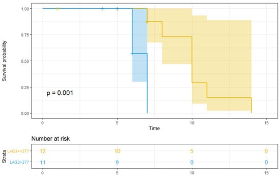 Only median sLAG > 377 pg/mL (Figure 3, p = 0.001) was significantly associated with lower OS (Table 3). Furthermore, patients with high sLAG3 showed a significant lower PFS (p = 0.047) and OS (p = 0.001) compared to those with low baseline value (Figure 2 and Figure 3).