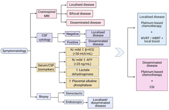 (Created with BioRender.com) Diagnostic algorithm of CNS germinomas. Abbreviations: MRI: magnetic resonance imaging; CSF: cerebrospinal fluid; β-HCG: beta- human chorionic gonadotropin; AFP: alpha fetoprotein; N: normal; WVRT: whole ventricular radiotherapy; WBRT: whole brain radiotherapy; CSI: craniospinal irradiation.
