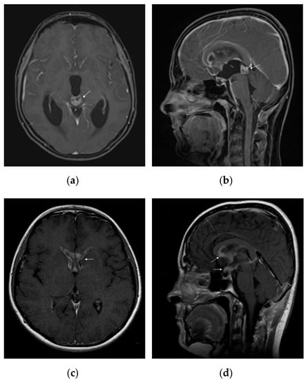 - Zhang, H.; Qi, S.-T.; Fan, J.; Fang, L.-X.; Qiu, B.-H.; Liu, Y.; Qiu, X.-Y. Bifocal germinomas in the pineal region and hypothalamo-neurohypophyseal axis: Primary or metastasis? J. Clin. Neurosci. 2016, 34, 151–157. [Google Scholar] [CrossRef]
