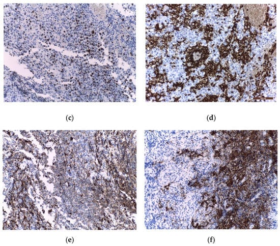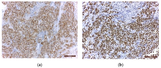 Immunohistochemistry (IHC) is further used to provide the histological diagnosis. The membrane immunoreactivity for C-kit (transmembrane protein with tyrosine kinase activity), CD30 (tumour necrosis factor receptor), and D2-40 (podoplanin) aid in differentiating germinomas from embryonal carcinoma and yolk sac tumours []. The nucleus is usually reactive for OCT 3/4 (octamer binding transcription factor 3/4), SALL4 (sal-like protein 4), UTF1 (undifferentiated embryonic cell transcription factor 1), NANOG (transcription factor in embryonic stem cells), and ESRG (embryonic stem cell-related gene protein), whereas ribosomes are positive for LIN28 (RNA-binding protein LIN28) [,]. Although PLAP is a distinctive marker of primordial cells, its expression is less consistent, being detected in 82% of germinomas. On the other hand, C-kit and OCT 3/4 are more sensible, with 100% staining among germinoma cells. When the germinoma also contains a syncytiotrophoblastic component, these cells are positive for hCG, human placental lactogen (HPL), CD 30, and CK AE1/3 (cytokeratin AE1/3) []. A summary of IHC staining and representative histological images from intracranial germinomas are shown in Table 2 and Figure 3 and Figure 4.