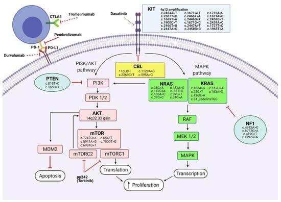 Gain of function mutations of KIT proto-oncogene generate a constitutive activation of the KIT protein, which consequently activates signal transduction molecules via MAPK (mitogen-activated protein kinase) or PI3K (phosphoinositide 3-kinase) pathways, resulting in increased cell proliferation, migration, and apoptosis resistance (Figure 5) [].