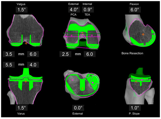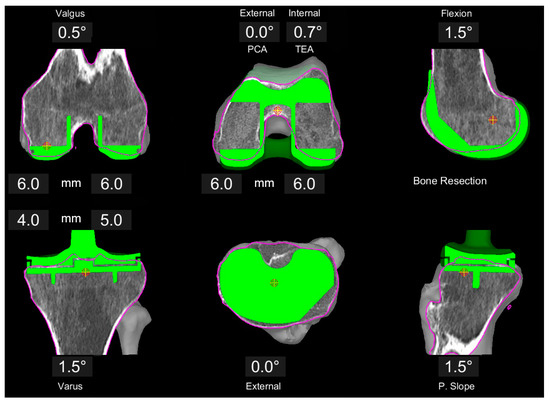 All surgeries were conducted with the MAKO robotic arm and the Triathlon PS knee system (Stryker, Kalamazoo, MI, USA). Prior to surgery, three-dimensional preplanning of the individualized component position using the proprietary MAKO software was conducted by the operating senior surgeon following the concept of kinematic alignment (KA) (Figure 1). First, the distal and posterior resections on the femur were set symmetrically at 6 mm bone resection. This results in an individual distal femoral angulation and a 0° rotation with reference to the posterior condylar axis (PCA) (individual rotation to transepicondylar axis (TEA)). In a second step, the femoral component size was defined to best reconstruct the anterio-posterior and medio-lateral dimensions without producing an overhang. Based on this position and size, the femoral flexion was adjusted to create a smooth anterior transition without notching.