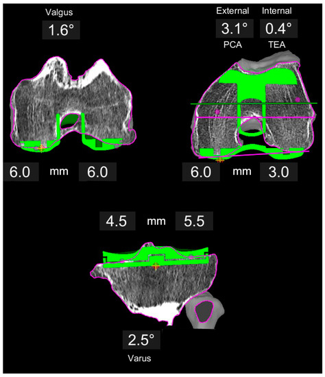 Example of a varus knee planned with restricted KA. The distal femoral resection is symmetric at 6 mm, whereas the posterior resection is adjusted to co-align the trochlea groove close to the native trochlea axis. This results in a 3.1° external rotation with respect to the PCA. Tibia follows the same principle as for KA (Figure 1).