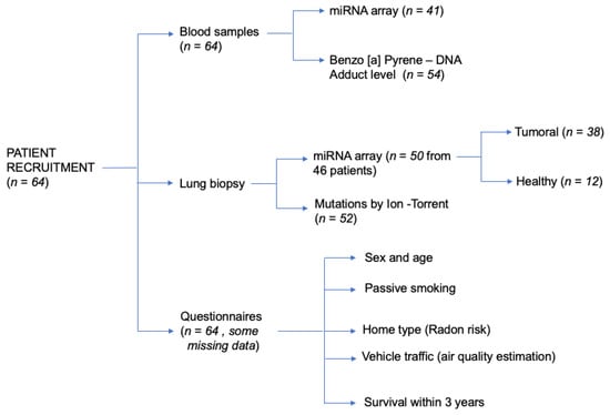 The criteria used for the patient enrolment was as follows: over 18 years of age, have lung cancer for which surgery treatment has been indicated, have been non-smokers or former smokers for at least 5 years, and have signed the written informed consent. No restriction was made regarding the sex of patients or the morphology of the reported neoplastic lesions. Both the neoplastic and healthy tissue samples were taken from the same patient and the tissue samples were obtained directly from the pathological anatomies of the hospitals involved in the project. Instead, the blood samples were collected by the thoracic surgery units of the hospitals. The interviews were carried out directly in the thoracic surgery wards by the cancer registry doctors involved in the study. A total of 64 patients were finally enrolled. All of the patients lived near the Etna volcano (average 56 km away, min 13 km away, and max 152 km away), their average age was 69.02 years old (min 43 years old and max 84 years old), 34.4% were female, and 20.3% of patients died within three years after the biopsy. A total of 15 subjects had never smoked, while 20 were former smokers for more than 20 years, 13 for 11 to 19 years, and 9 for 10 to 5 years, and the smoking habits data was missed for 14 patients. Data were collected by trained personnel using a semi-structured questionnaire to obtain information on the sociodemographic and lifestyle data, including smoke history, nutrition, home characteristic, and home location (for Radon and urban traffic pollution exposure evaluation) (Figure 1).