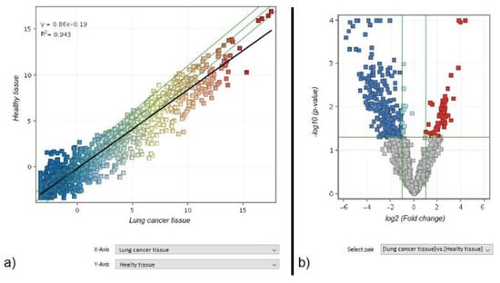 (a) Scatter plot analysis comparing miRNA expression (dots) according to their level of expression in healthy (vertical axis) vs. cancer (horizontal axis) tissues of the examined patients. The miRNA colour reflects the signal intensity (red is high, yellow is intermediate, and blue is low). The diagonal green lines indicate the two-fold variation interval. The best-fit regression line is reported in black. Its slope towards the horizontal axis reflects the overall downregulation of miRNA expression in cancer compared with healthy lung tissue. (b) Volcano plot analysis identifying miRNAs with an altered expression above two-fold (horizontal axis) and above the statistical significance threshold (p < 0.05) (vertical axis) in cancer vs. healthy lung tissue, either downregulated (blue) or upregulated (red).