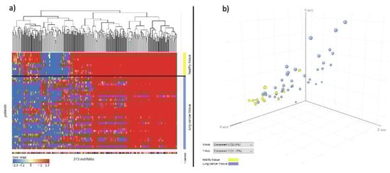 (a) Clustering hierarchical analysis reporting the expression of the 273 lung cancer related miRNAs in healthy tissue (vertical axis, yellow bar) and lung cancer tissue (vertical axis, blue bar) in the 50 samples tested (horizontal lines). (b) Principal component analysis of variance identifying the samples from healthy tissues (yellow dots) and cancer tissues (blue dots) according to the variance of the expression of the 273 lung cancer related miRNAs. dots size = principal component analysis score.