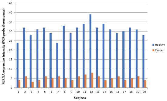 Let-7a expression in healthy (blue) vs. cancer (red) lung tissue as evaluated by qPCR in 20 patients (x-axis). miRNA expression intensity is expressed in fluorescent units (y-axis).