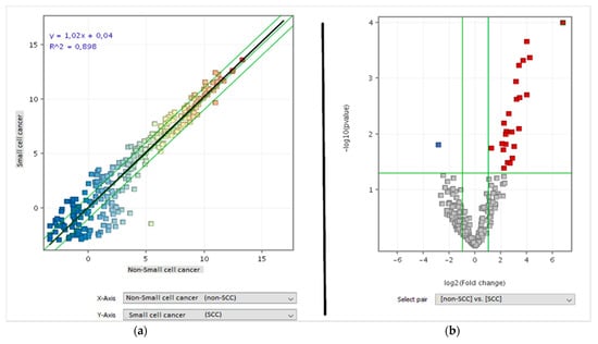 (a) Scatter plot analysis comparing miRNA expressions (dots) according to their level of expression in SCLC (vertical axis) vs. NSCLC (horizontal axis). miRNA color reflects the level of expression (red is high, yellow is intermediate, and blue is low). The diagonal lines indicate the two-fold variation interval. (b) Volcano plot analysis identifying miRNAs whose expression was altered more than two-fold (horizontal axis) and above the statistical significance threshold (p < 0.05) (vertical axis) in SCLC vs. NSCLC cancer downregulated (blue) or upregulated (red).