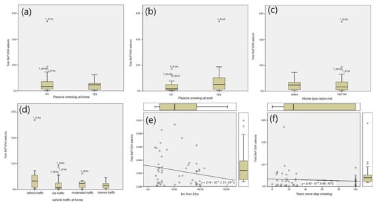 Box plot analysis for total BaP DNA adducts in: (a) passive smoking at home, (b) passive smoking at work, (c) radon risk home type, (d) vehicle traffic at home, and linear regression for (e) distance from the Etna volcano, and (f) years since smoking cessation.