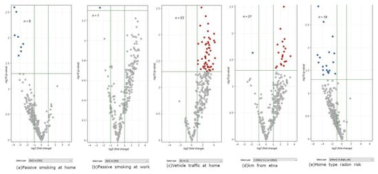 The number of miRNAs composing each environmental signature was as follows: (a) passive smoke at home, n = 8; (b) passive smoke at work, n = 1; (c) vehicle traffic, n = 53; (d), distance from the Etna volcano, n = 21; and (e) radon risk, n = 19. The volcanos plot analyses comparing miRNA expression in the lungs between unexposed vs. exposed subjects for each environmental signature are reported in Figure 7.