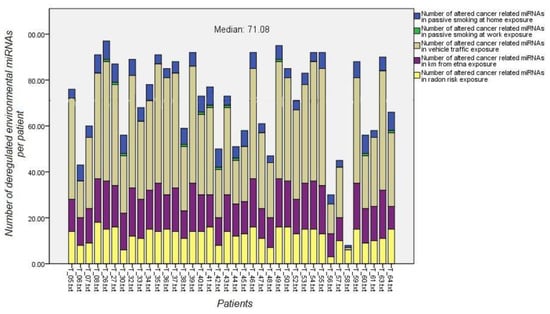 Environmental exposure miRNA signatures were compared by Venn diagram analysis, with the miRNAs composing the individual cancer-related signature of each patient. This approach was used to identify the relative contribution of the environmental risk factors to cancer development in each patient (Figure 8).