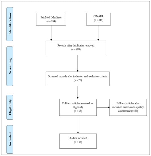 The document search resulted in 1253 documents, including 934 items from PubMed and 319 items from CINAHL. Because of duplication, 764 items were excluded during the initial screening. The remaining 478 publications were further investigated to assess their adherence to the inclusion and exclusion criteria. From this first screening, 68 papers were eligible. These publications were distributed to all authors to perform quality assessment tests.