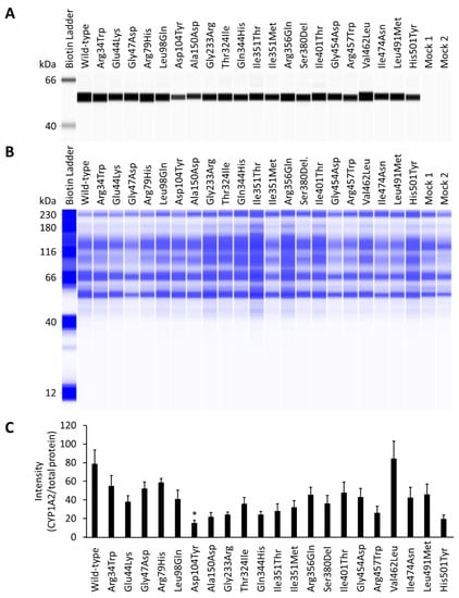Immunoassays were performed using the Wes (ProteinSimple, San Jose, CA, USA) and Compass for SW ver. 4.1.0 (ProteinSimple) software to evaluate CYP1A2 protein expression levels. Briefly, 100 ng of microsomes containing CYP1A2 wild-type and variant proteins were loaded into each well. CYP1A2 levels were detected using a polyclonal anti-CYP1A2 antibody (1:100 dilution) and HRP-conjugated goat anti-rabbit IgG. A total protein assay was performed to normalize each signal using 100 ng of microsomes, as per the manufacturer’s instructions [28].