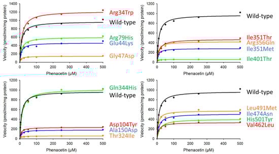 Phenacetin O-deethylation activity was measured using a modification of previously described methods; kinetic parameters were subsequently determined using Michaelis–Menten curves (Figure 2). Enzymatic activities were normalized to the corresponding CYP1A2 total protein quantified by Western blotting (Table 3). The O-deethylation of phenacetin was assessed using microsomal protein fractions containing wild-type or variant CYP1A2 (25 μg); this revealed that 4-acetamidophenol was formed linearly, in a time-dependent manner, for incubation times of up to 40 min (data not shown). Among these, 13 variants (Glu44Lys, Gly47Asp, Arg79His, Asp104Tyr, Ala150Asp, Gly233Arg, Thr324Ile, Ile351Thr, Ile351Met, Arg356Gln, Ile401Thr, Val462Leu, Ile474Asn, Leu491Met, and His501Tyr) were found to show significantly lower CLint and Vmax values than the wild-type. Conversely, the Km values for all the variants evaluated did not differ significantly from those of the wild-type. Regarding Gln344His, this variant was found to have a CLint value slightly lower than that of the wild-type, while its Vmax and Km values did not differ significantly. The kinetic parameters of the remaining five variants (Leu98Gln, Gly233Arg, Ser380del, Gly454Asp, and Arg457Trp) could not be determined, since 4-acetamidophenol formation was negligible.