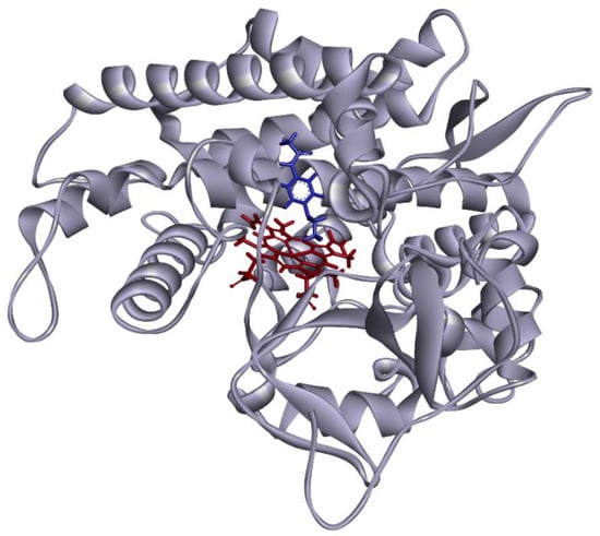 Diagram of the overall structure of CYP1A2. The heme group is shown in red; phenacetin is shown in blue. The distance between the central iron and the metabolic site was calculated as 4.32 Å.