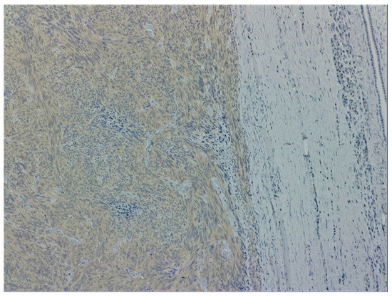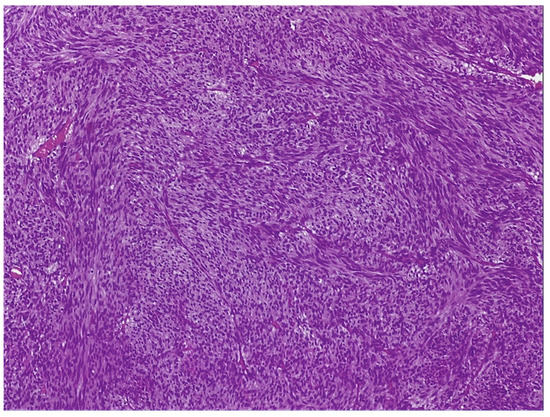 Macroscopically, GISTs are white in color, well-defined, not encapsulated and have a firm consistency [23]. The section surface may be homogeneous, seen mostly in small-size GISTs, or heterogeneous, with areas of hemorrhage and necrosis in larger tumors. In small tumors, the coating mucosa remains unchanged (appearing normal), but in large, more aggressive tumors, it may ulcerate. Microscopically, GISTs may have a moderate or high cellularity and can be divided into three main types [23,24]: