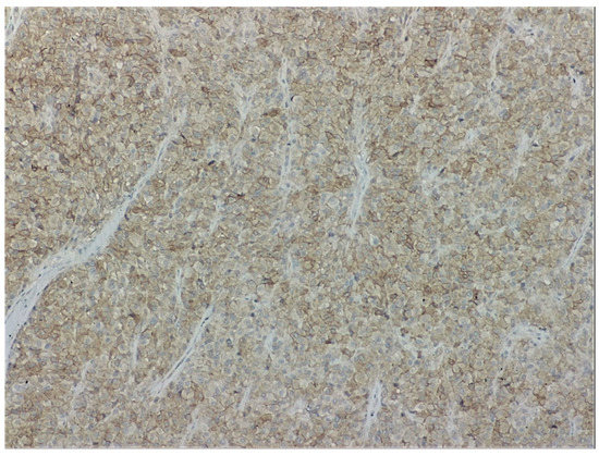 Figure 5. Histological aspects of an epithelioid type of GIST-DOG1 positive. Membranous and cytoplasmic staining in tumor cells (DOG1, 100×). From the collection of Dr. Valentin Enache.