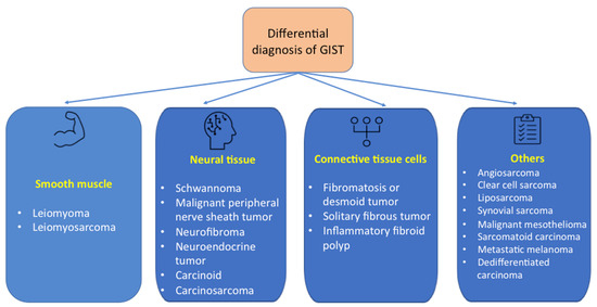 The differential diagnosis is made with other sub-epithelial tumors, as listed in Figure 6 [46,47,48].