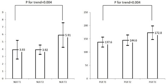 Regarding the primary and secondary outcome measures, the higher NRL and PLR were compared using Pearson’s chi-squared test for categorical variables and Student’s t-test or the Mann–Whitney U test for continuous variables. To evaluate the independent effects of dichotomized NRL and PLR on outcome measures, we performed a binary logistic regression analysis. Variables for adjustment in the multivariate analysis were selected if their p values were <0.1 in comparison according to the NRL and PLR and if their associations with each outcome variable were clinically plausible. Crude and adjusted odds ratios (ORs) and 95% confidence intervals (CIs) were estimated.