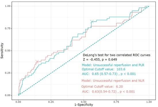 The ROC curve showed that the predictive ability of both NLR and PLR was close to good (AUC of NLR: 0.63, 95% CI (0.54–0.72), p < 0.001; AUC of PLR: 0.65, 95% CI (0.57–0.73), p < 0.001). There were no significant differences in the prediction of unsuccessful reperfusion between NLR and PLR. The cutoff values of NLR and PLR were 6.2 and 103.6 for unsuccessful reperfusion, respectively (Figure 2).