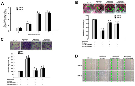The arecoline-elicited LINC00084 mediates the myofibroblast activation. (A) The relative gene expression of LINC00084 in two buccal mucosal fibroblasts (BMFs) in response to the indicated concentration of arecoline. * p < 0.05 compared to control group (no arecoline); the arecoline-induced myofibroblast activities, including the enhanced collagen gel contraction (B), transwell migration (C), and wound healing capacities (D) were measured in arecoline-treated BMFs transfected with sh-LINC00084. Results are means ± SD of triplicate samples from three experiments. * p < 0.05 compared to Sh-Luc. group. # p < 0.05 compared to the arecoline + Sh-Luc. group.