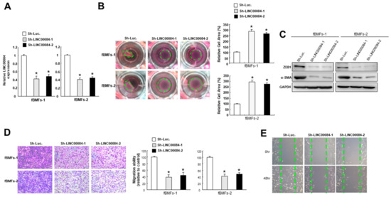Suppression of LINC00084 attenuates the myofibroblasts properties. (A) The knockdown efficiency of sh-LINC00084 in two patient-derived fBMFs; collagen gel contractility (B), the expression level of ZEB1 and α-SMA (C), transwell migration (D), and wound healing (E) abilities were examined in two fBMFs transfected with sh-Luc. or sh-LINC00084. Results are means ± SD of triplicate samples from three experiments. * p < 0.05 compared to sh-Luc. group.