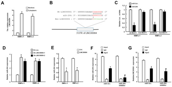 LINC00084 curbs the expression of miR-204 in fBMFs. (A) The relative cytoplasmic and nuclear levels of LINC00084 in fBMFs analyzed by qRT-PCR. * p < 0.05 compared to the nucleus group; (B) schematic representation of the alignment of the LINC00084 base pairing with miR-204. Wild-type (Wt) and mutated (Mut) LINC00084 reporter plasmids were co-transfected with miR-204 or empty vectors (miR-Scr.); (C) the relative luciferase activity of each combination in two fBMFs was assessed and only WT reporter activity was suppressed by miR-204; (D) the relative expression of miR-204 in two fBMFs transfected with sh-Luc. or sh- LINC00084; (E) the expression level of miR-204 in two LINC00084-overexpressing fBMFs; (F) enrichment of miR-204 (F) or LINC00084 (G) relative to input was assessed via the RIP experiment using anti-Ago2 in fBMFs transfected with miR-Scr. or miR-204 inhibitor with anti-IgG as a negative control. The relative expression levels of miR-204 and LINC00084 were detected by qPCR * p < 0.05 compared to sh-Luc. or control group; # p < 0.05 compared to miR-Scr. group.