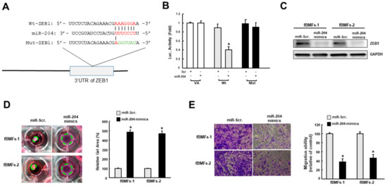 Given that ZEB1 is crucial to the transdifferentiation of myofibroblast [10] and a predicted target of miR-204, ZEB1 wild-type (Wt) or mutant 3′-UTR (Mut) (Figure 5A) was subcloned into a luciferase reporter vector and co-transfected with miR-204 mimic or miR-scrambled (negative control). The luciferase activity of each combination was assessed and transfection of miR-421 significantly inhibited the activity of the wild-type group (Figure 5B). Besides, results from western blot demonstrated that the expression of ZEB1 was inhibited in fBMFs with miR-204 mimics (Figure 5C). Next, we showed that two myofibroblast features, the increased collagen gel contractility, and transwell migration, were both attenuated in fBMFs transfected with miR-204 mimics (Figure 5D,E). Taken together, our findings in conjunction with the results from the previous investigation [10] suggested that miR-204 hampers the myofibroblast activation via suppression of ZEB1.