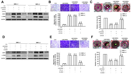 LINC00084 promotes myofibroblast transdifferentiation of BMFs via regulation of miR-204/ZEB1 axis. (A) Protein expression of ZEB1 and α-SMA, (B) migration ability and (C) collagen gel contraction in BMFs co-transfected with LINC00084 overexpression plasmids, miR-Scr., or miR-204 mimics; (D) protein expression of ZEB1 and α-SMA, (E) migration ability, and (F) collagen gel contraction in BMFs co-transfected with LINC00084 overexpression plasmids, Sh-Luc., or Sh-ZEB1. Results are means ± SD of triplicate samples from three experiments. * p < 0.05 compared to Ctrl. group. # p < 0.05 compared to the LINC00084 overexpression group.