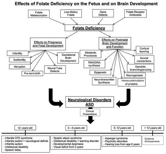 After birth, it is crucial for the offspring to have an adequate amount of folate in their diet. Instead of rapid cell division as embryogenesis calls for, postnatal development requires folate for neural progenitor differentiation as well as proliferation [28]. It has yet to be fully elucidated what the detailed mechanisms of folate action are, but the folate deficiency produced in animal models during early postnatal development illustrates the importance of folate in preventing developmental and cognitive deficits [23,27]. Researchers have also reported changes in neuronal excitability and maintenance that arise with a decrease in brain folate in a rat model [29]. Others have reported an increase in p53 and signs of homocysteine accumulation in the neurons and astrocytes [30]. There was a long-term effect on locomotor function and cognition in these animals. Therefore, folate is necessary for maintenance of neuronal function, as well. Based on this, further investigations into the mechanisms of folate metabolism in neurons and support cells of the brain are necessary. Thus far, folate has been linked to neuronal repair and differentiation after injury, myelin formation and maintenance and neuronal plasticity [30,31,32]. Figure 1 provides a summary of the effects of folate deficiency on fetal and post-natal brain development and the consequent sequelae that contribute to neurologic deficits.
