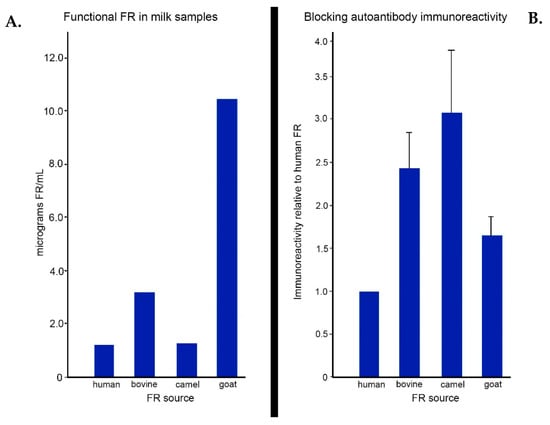 (A) Folate receptor concentrations in milk. (B) Immune cross-reactivity of blocking autoantibodies against various FR antigens. The blocking assay was performed by testing a known amount of blocking activity in serum samples from 8 different patients with molar equivalent amounts of FR antigens from milk. Blocking activity was determined as pico moles of 3HPGA blocked and was compared to blocking in human milk antigen.
