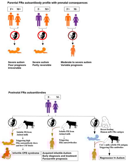 Compared to infantile-onset CFD syndrome where FRα antibody testing remained negative in the parents, testing of the parents of children with autism revealed a prevalence of 34% in mothers and 29% in fathers versus 3% in healthy controls [51]. Another study also confirmed an equal prevalence of FRα autoimmunity in children with autism (76%) and even higher autoantibody prevalence in their unaffected siblings (75%), fathers (69%) and mothers (59%) [62]. The appearance of these antibodies may have a familial heritable origin, but the risk of developing ASD is likely influenced by other unknown factors because some siblings positive for these antibodies have been asymptomatic. Two of the suspected determinant factors for the development of autism are the appearance of antibodies at a critical stage of neurodevelopmental processes during the first 18 months of life and fetal exposure to maternal antibodies.