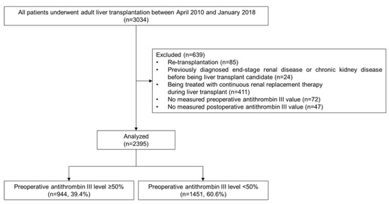 This retrospective observational study was approved by the institutional review board of our center (No.2019-1699). All patients who were reviewed underwent either living- or deceased-donor LT (LDLT, DDLT) from April 2010 to January 2018. Of the 3034 identified adults (≥18 years of age), re-transplantation cases (n = 85), patients who had been previously diagnosed with end-stage renal disease or CKD (n = 24), patients who were being treated with continuous renal replacement therapy (n = 411), and patients who did not have preoperative (n = 72) or postoperative (n = 47) ATIII levels were excluded. Finally, 2395 patients were included in our final analysis (Figure 1).